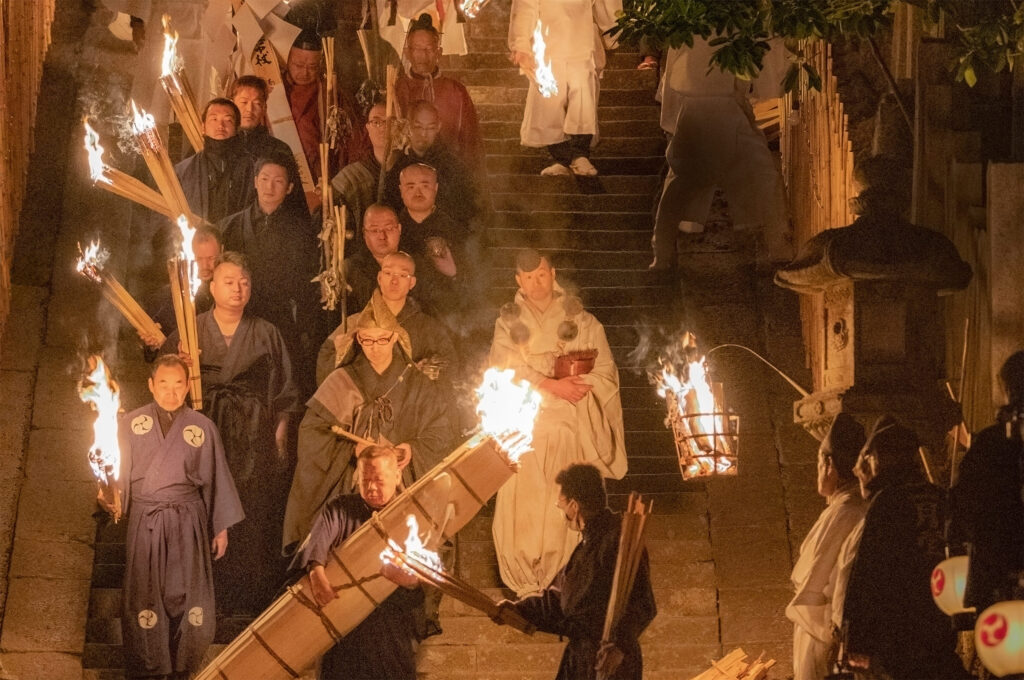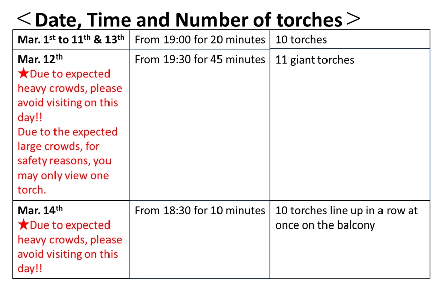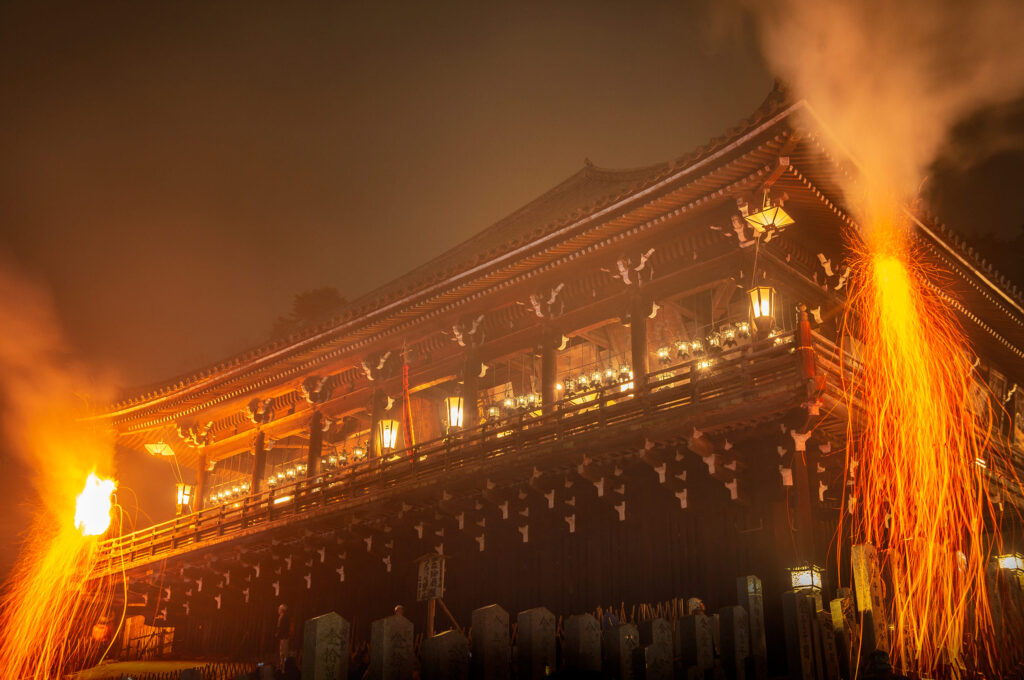 Every night over the two weeks from March 1st to 14th during Shuni-e, huge torches are waved from the balcony of the Nigatsudō. On dark nights, torchbearers one by one guide the monks between their Shelter of Reclusion and the Nigatsudō.
