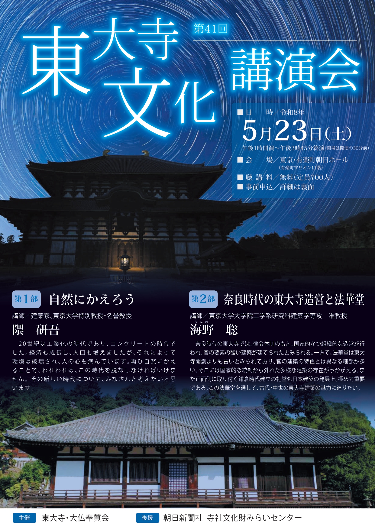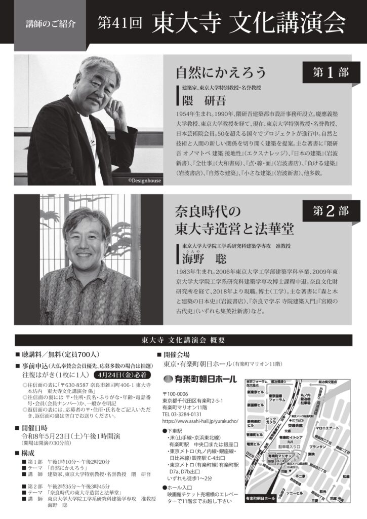 「第41回東大寺文化講演会」(東大寺、大仏奉賛会主催、朝日新聞社寺社文化財みらいセンター後援)を開催いたします。