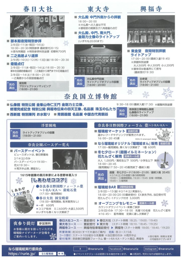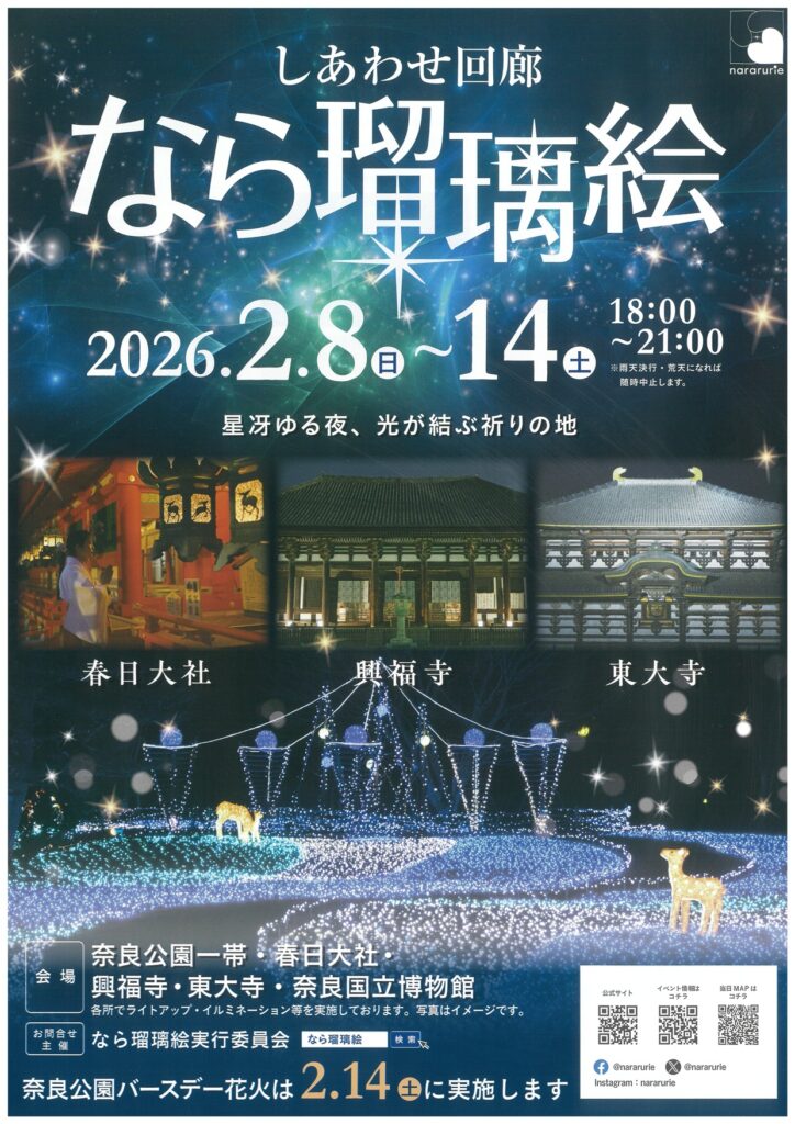 '26/1/28更新 お知らせ (2/8~14)「なら瑠璃絵」開催による東大寺ライトアップ 2/8(日)~14(土)「なら瑠璃絵」が開催されます。 東大寺では18:00~20:00、大仏殿、中門、南大門及び金剛力士像がライトアップされます。 ★大仏殿への入堂はできませんが、中門外側からの拝観していただきます。 「なら瑠璃絵」の公式ホームページはこちらよりご覧いただけます。