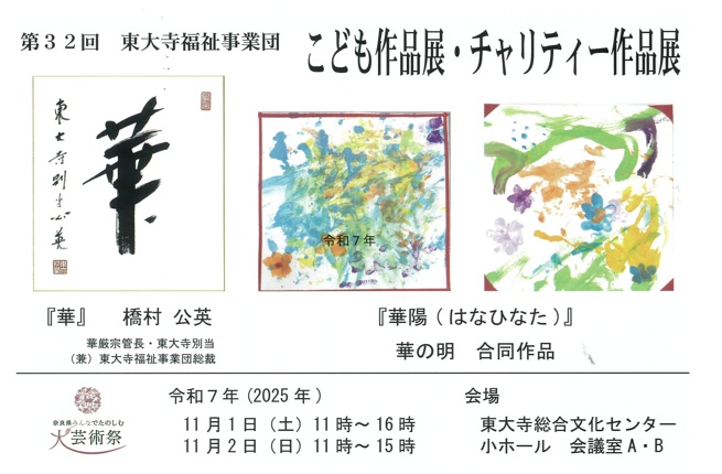 '25/10/10更新 お知らせ (11/1-2) 東大寺福祉事業団 第32回こども作品展・チャリティー作品展 「第32回東大寺福祉事業団 こども作品展・チャリティー作品展」が開催されます。福祉療育病院に入所または、通所しているこども達が作った素敵な作品を展示し、同じく成人の方が日々の活動で作られた作品も一部販売いたします。また、東大寺別当、長老、塔頭住職の書画をはじめ、陶芸や写真など、有縁の皆さまから出品いただきました作品も展示、販売いたします。日時:11月1日(土)11時~16時 11月2日(日・祝)11時~15時場所:東大寺総合文化センター地下1階、小ホール、会議室A・B ※昨年までは大仏殿内西廻廊、集会所で開催されていましたが、今年は東大寺総合文化センター内で開催されます。